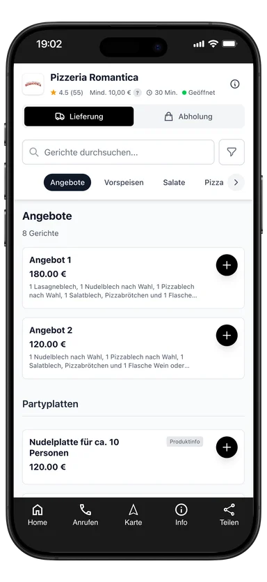 1 Nudelblech nach Wahl, 1 Pizzablech nach Wahl, 1 Salatblech, Pizzabrötchen und 1 Flasche Wein oder Coca-Cola - für ca. 10 Personen